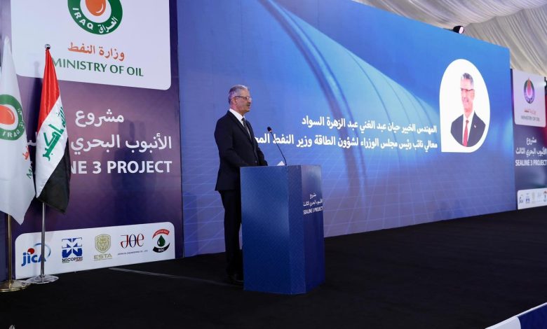 وقال عبد الغني في مؤتمر صحفي عقده عقب افتتاح المشروع “نحتفي اليوم من ميناء الفاو الكبير بانطلاق عقد مهم واستراتيجي يتعلق بإكمال الأنبوب البحري الثالث، الذي يمثل شرياناً حيوياً لنقل النفط الخام من مستودع الفاو النفطي إلى موانئ التصدير في الخليج “.
